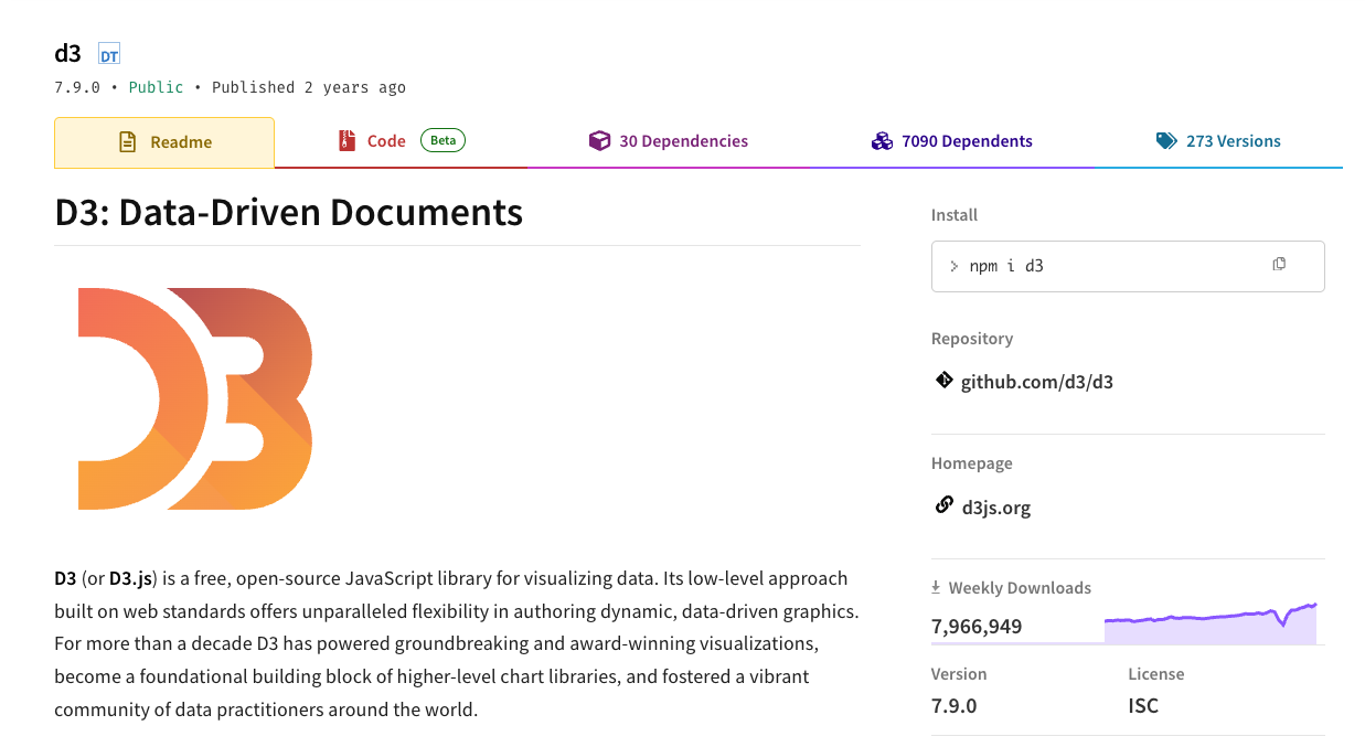This is what the D3.js page looks like on the NPM website.